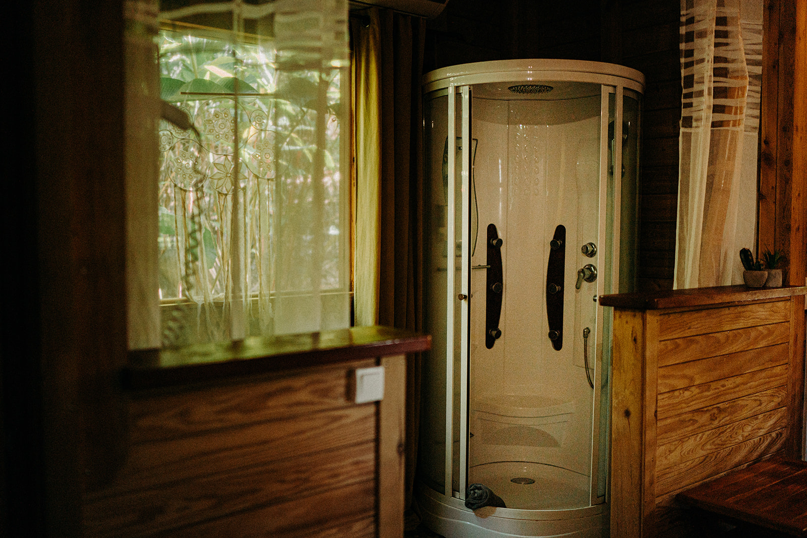 Une salle d’eau avec douche donnant sur le parc